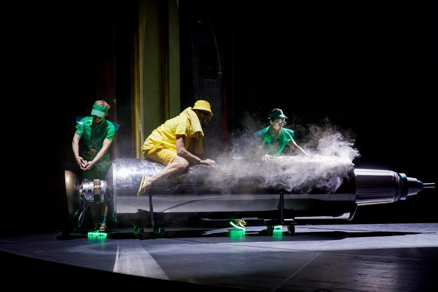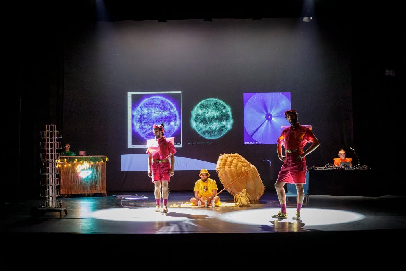 in a performance at Theatre Chur in Switzerland, combining installation-based spatial design, live music, sculptural costumes, light play, planetary choreography, and narrative experimentation. The piece reflected on the sun as both life-giving and potentially catastrophic, merging scientific insight, mythology, and artistic imagination to explore how a similar event might affect a fully electrified, digital society.